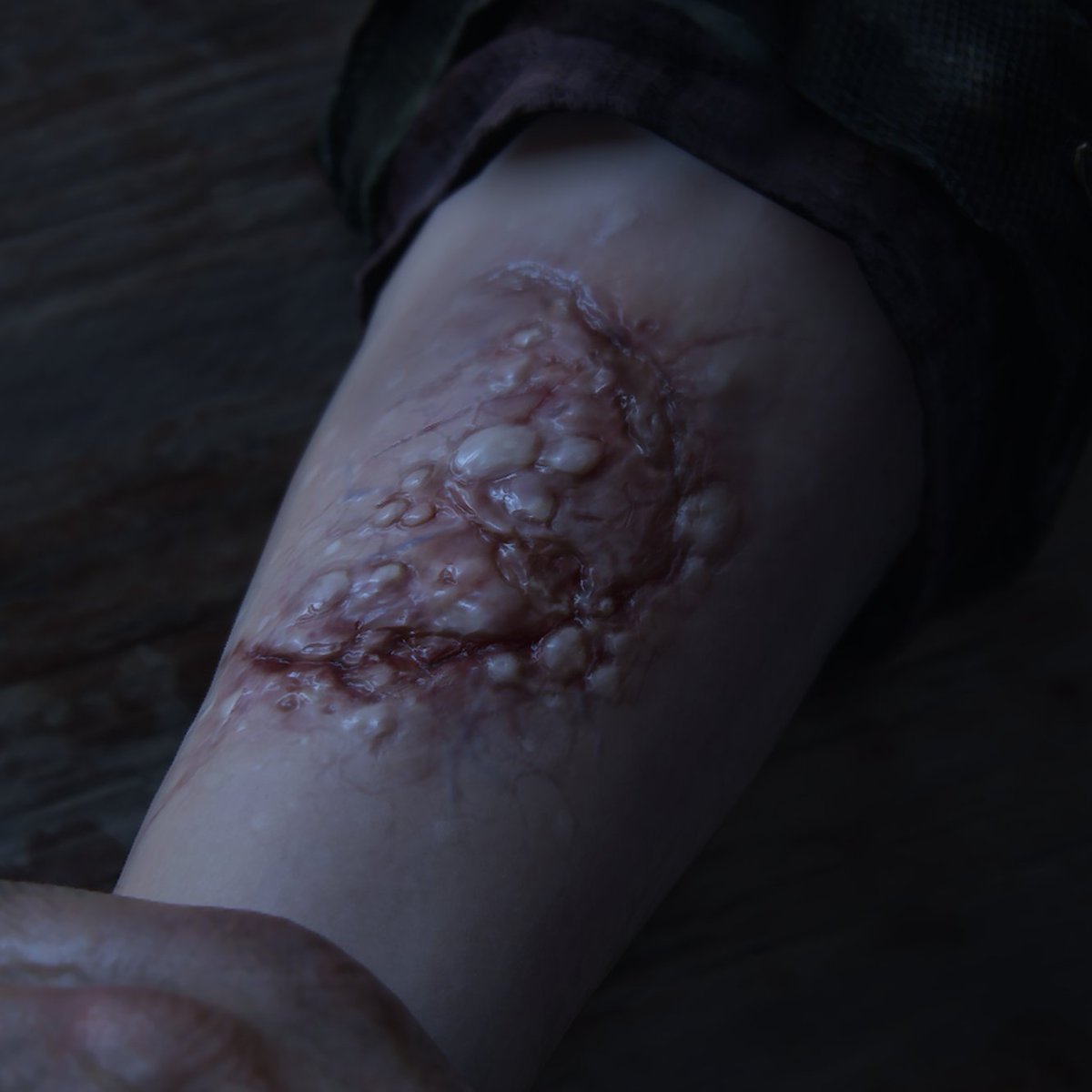 when she is not wearing long sleeves, Ellie has her arm visibly wrapped, and will tell anyone who asks that it's a chemical burn. it's actually a healed over bite mark, cw for a gnarly photo.